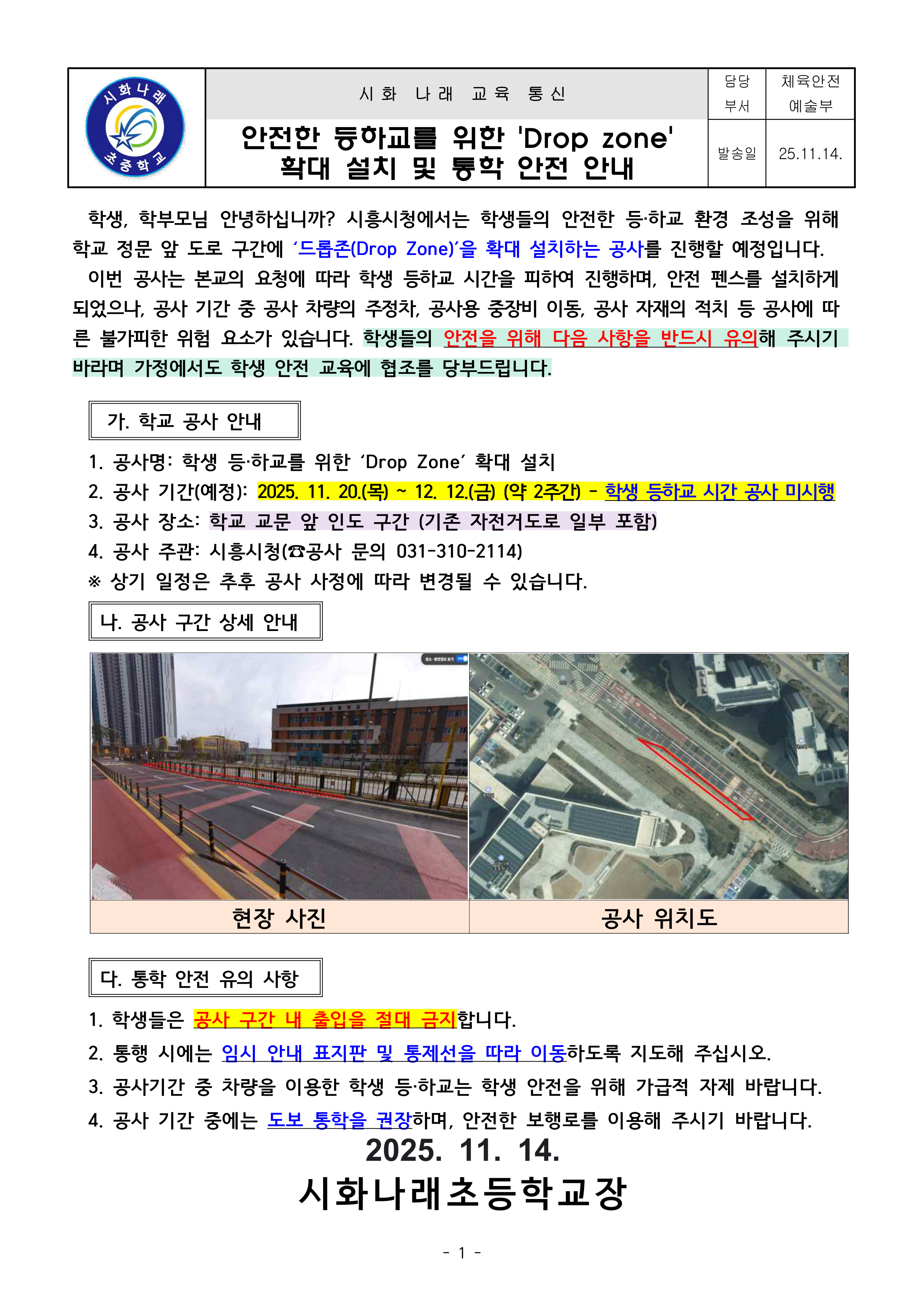 Çлý, Çкθð´Ô ¾È³çÇϽʴϱî? ½ÃÈï½Ãû¿¡¼´Â ÇлýµéÀÇ ¾ÈÀüÇÑ µî·Çϱ³ ȯ°æ Á¶¼ºÀ» À§ÇØ Çб³ Á¤¹® ¾Õ µµ·Î ±¸°£¿¡ ‘µå·ÓÁ¸(Drop Zone)’À» È®´ë ¼³Ä¡ÇÏ´Â °ø»ç¸¦ ÁøÇàÇÒ ¿¹Á¤ÀÔ´Ï´Ù.